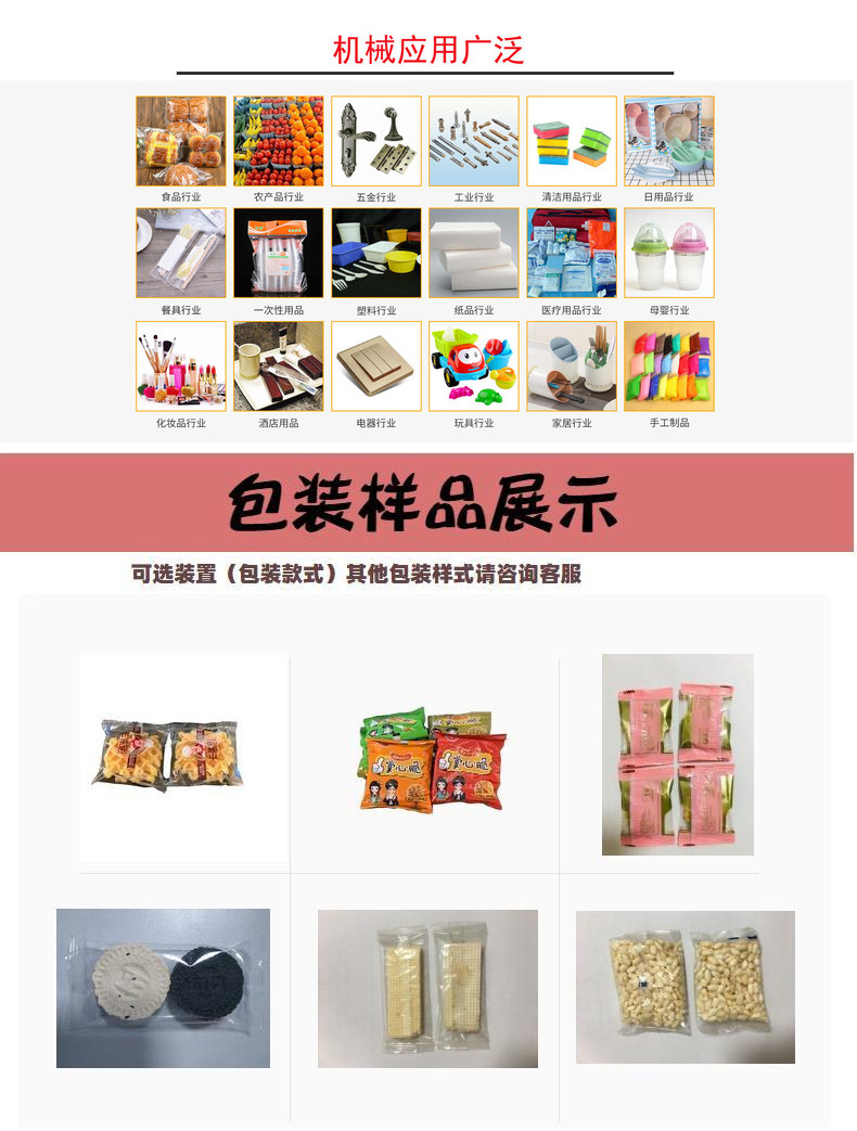 | 自动化程度 | 全自动 | 适用对象 | 服装,化妆品类,清洁、洗涤用品,食品 日用百货 | 适用行业 | 食品,服装,玩具,餐饮,医药,五金、机械 |