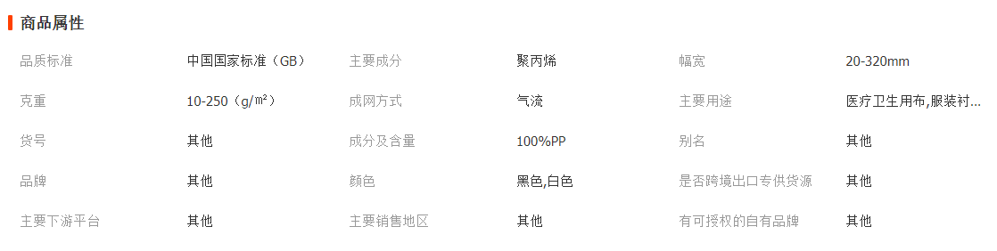 产品规格: 克重15~250GSM;幅宽20~240CM;颜色可以定制