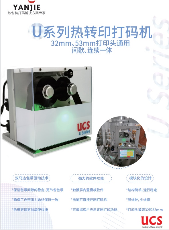 U系列热转印打码机打印面积可达53mm x 180mm,可以将产品配料表和营养成分表及各种复杂信息打印在产品软包装上,帮助客户节省印刷成本,同时降低包装膜的浪费。