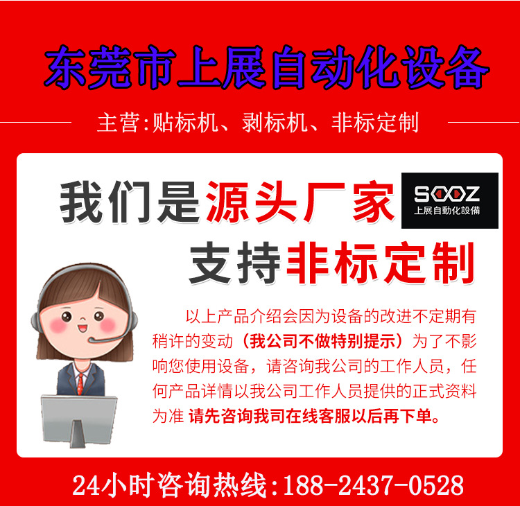 详细信息 订货号SZ-8962 加工定制是 货号SZ-8962 类型不干胶贴标机 品牌上展 型号SZ-8962 贴标速度1600(瓶/分) 贴标精度±0.02(mm) 标签最大宽度80(mm) 被贴物尺寸20(mm) 适用对象线材 包装材料塑料,薄膜 包装类型箱 适用行业线材 自动化程度全自动 售后服务一年保修,终身维护 是否跨境出口专供货源否