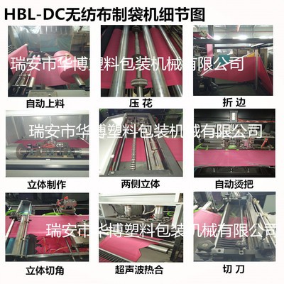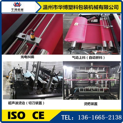 1.该机适用原材料为无纺布,能加工各种不同规格,不同型状的无纺布穿皮筋袋、穿绳袋、平口袋等,该机集机电为一体,运用LCD触摸屏操作。配以步进步式定长,光电跟踪,电脑自动定位,电脑自动纠边,准确,平稳,自动计数,即可设定计数报警,自动打孔,自动烫把手等工控装置,使其生产的成品封线牢固,切线美观。高速效,是你可以放心适用的环保型制袋设备。